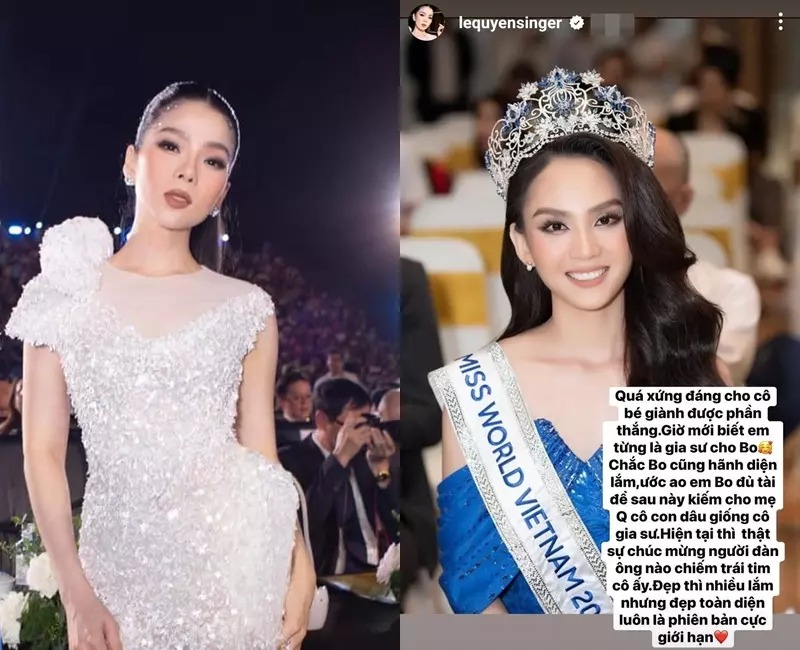 Lệ Quyên nói ǵ khi t́nh tin đồn của chồng cũ đăng quang? 1 Attachment(s) Ca sĩ Lệ Quyên là một trong những thành viên ban giám khảo chung kết Miss World Vietnam - Hoa hậu Thế giới Việt Nam 2022. Sau chiến thắng của Huỳnh Nguyễn Mai Phương. Mới đây Lệ Quyên có đôi lời chia sẻ về tân hoa hậu. Khen chiến thắng này xứng đáng, giọng ca Bolero cũng tỏ ra thích thú khi biết Mai Phương là gia sư của con trai cô. Lệ Quyên cũng mong sau này có một nàng dâu toàn diện như người đẹp Đồng Nai. "Quá xứng đáng cho cô bé giành được phần thắng. Giờ mới biết em từng là gia sư cho Bo. Chắc Bo cũng hănh diện lắm. Ước ao em Bo đủ tài để sau này kiếm cho mẹ Quyên cô con dâu giống như cô gia sư. Hiện tại th́ thật sự chúc mừng người đàn ông nào chiếm trái tim cô ấy. Đẹp th́ nhiều lắm, nhưng đẹp toàn diện luôn là phiên bản cực giới hạn", Lệ Quyên hết lời khen Mai Phương. Trước đó, khi trở thành chủ nhân vương miện Miss World Vietnam 2022, Mai Phương cũng bị đào lại nghi vấn hẹn ḥ doanh nhân Đức Huy. Cụ thể, vào tháng 10/2021, Đức Huy gây xôn xao khi đăng ảnh con trai Bo bên "cô giáo", và đó chính là Miss World Vietnam của hiện tại. Bức ảnh lập tức gây "băo" mạng xă hội, khiến tin đồn Mai Phương hẹn ḥ chồng cũ Lệ Quyên rộ lên. Trước những lời đồn thổi, Mai Phương trực tiếp bác bỏ, khẳng định độc thân và cho biết chỉ là gia sư cho con trai nam doanh nhân. "Phương không nghĩ chỉ v́ một tấm h́nh kỷ niệm cùng cậu học tṛ nhỏ thật dễ thương lại gây hiểu lầm cho Phương và gia đ́nh anh Đức Huy. Chuyện này ảnh hưởng đến bản thân Phương và gia đ́nh rất nhiều. Mai Phương với anh Đức Huy chỉ đơn thuần là mối quan hệ giữa công việc - công việc, không phải chuyện yêu đương như đồn đoán. Hiện nay Phương tập trung toàn bộ tâm sức cho sự nghiệp, học vấn và trau dồi bản thân. Mai Phương hoàn toàn độc thân, và cảm thấy vui v́ điều đó", cô chia sẻ thời điểm ấy. Đức Huy cũng gửi lời xin lỗi Mai Phương v́ khoe bức ảnh cô tṛ dẫn tới những hiểu nhầm không đáng có. "Mong là em vẫn tiếp tục dạy Bo. Vàng thật không sợ lửa em à", đại gia 7X bày tỏ. |