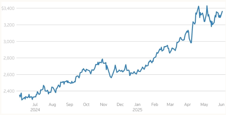 Chốt phiên giao dịch 2/6, giá vàng thế giới giao ngay tăng 92 USD lên 3.380 USD một ounce. Sang phiên sáng 3/6, giá tiếp tục lên 3.386 USD - cao nhất kể từ đầu tháng 5.