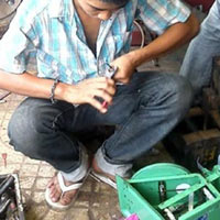 Ngay lập tức H. cho người dẫn chúng tôi ra lò độ cân nằm sâu trong con hẻm nhỏ cách nhà H. khoảng 500m. Tại đây, ba thợ độ đang làm việc miệt mài. Một người thợ vừa hì hục độ cân, vừa quảng cáo: "Làm già đi mấy lạng rồi bấm chì lại như cũ thì như cân mới thôi, chỉ người trong nghề mới phát hiện". Để minh chứng cho lời nói của mình, anh ta chỉ vào bản chi chít số lượng hàng cần làm, ngày giao ghi trên chiếc bảng cũ kỹ treo trên tường.