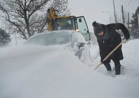 Một phụ nữ cố gắng dọn tuyết phủ kín chiếc ô tô của cô ở Romania. 3 trường hợp tử vong cũng được thông báo tại Serbia và một tại Bulgaria.