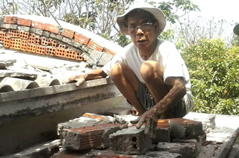 Ông Nguyễn Đoàn bên phần mộ vừa đập bỏ trên nóc nhà ḿnh