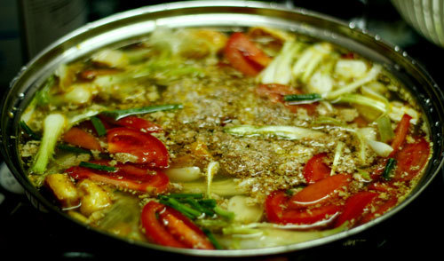 - Cho nồi măng chua vào nồi lẩu chuyên dụng, thêm phần riêu cua và gạch cua vào nồi, đun sôi thì cho thêm đậu bắp, dọc mùng, hành lá, mùi tàu, đậu phụ non và các loại rau ăn kèm. Dùng kèm với bún và nước mắm xắn với ớt quả.