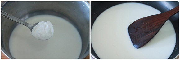 Đổ sữa ra nồi nhỏ, thêm đường, sữa đặc, bột bắp vào khuấy đều. Bước 2: