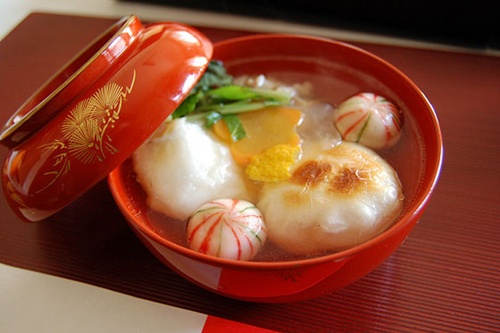 Ozouni là một loại súp của Nhật, được cho là món tốt lành nhất khi ăn đầu năm mới Âm lịch. Súp gồm bánh gạo Mochi, thịt gà hoặc cá, rau.... Mỗi gia đình và vùng lại có nguyên liệu riêng cho súp ozouni. Bánh gạo Mochi rất dẻo và dính, vì vậy mỗi năm, ở Nhật có vài người chết trong dịp năm mới vì nghẹn mochi. Ảnh: Alafista