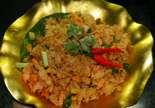 - Phi thơm tỏi, cho tôm vào xào tơi, tiếp đến cho cua vào với ít hạt nêm. Xào chín cho cơm trắng vào trộn đều, thêm ít màu hạt điều để có màu vàng đẹp mắt.