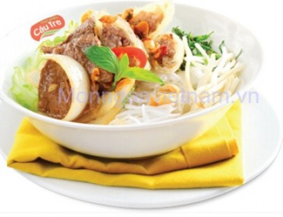 - Dưa leo xắt nhỏ. Trụng bún cho vào tô, xếp chả giò chiên, thịt bò xào, rau, giá, dưa leo lên mặt, rắc thêm đậu phộng rang, hành tím phi. Dùng kèm nước mắm chua ngọt.