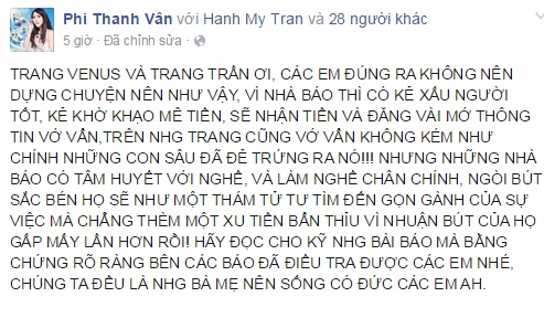 Mới đây nhất, trên trang cá nhân của mình, Phi Thanh Vân đã đăng tải đoạn trạng thái khá dài nhằm chỉ đích danh Trang Trần chính là người đã hãm hại, bịa đặt chuyện cô vờ mang thai, quỵt tiền từ thiện và muốn chia rẽ vợ chồng cô. Theo đó, "Nữ hoàng dao kéo" cho rằng, lẽ ra Trang Trần không nên dựng chuyện như vậy vì nhà báo có người tốt, kẻ xấu, họ không tiếp tay cho những trò "bẩn" và đáng lên án. Đồng thời, Phi Thanh Vân cũng khuyên Trang Trần nên sống có đức hơn dù sao cô cũng sắp được làm mẹ.