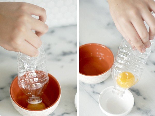 5. Tách lòng đỏ trứng chưa bao giờ thú vị hơn thế, bạn chỉ cần giữ lại một vỏ chai nhựa sạch, bóp bẹp rồi đặt miệng chai vào lòng đỏ trứng, thả ra là lòng đỏ được hút lên rồi.