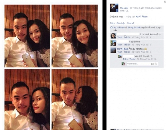 Trong khi người hâm mộ chưa kịp hết "sốc" thì mới đây, cư dân mạng thêm lần nữa "dậy sóng" với hình ảnh ghi lại khoảnh khắc khá thân mật giữa Hạ Vi và một người đàn ông lạ mặt có tên P.T.A. Bức ảnh được P.T.A đăng lên trang cá nhân cùng dòng chú thích khá dễ thương: "Ghét cái mặt". Có thể thấy, cả hai selfile khá thân mật và rất vui vẻ khi được ở bên nhau. Thậm chí, Hạ Vi còn ghé môi hôn nhẹ lên má người đàn ông này.