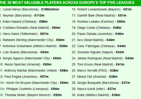 Xếp thứ 2 là Neymar, người đã thực sự tạo nên cú đột phá trong năm qua. Chân sút người Brazil có giá tới 113 triệu bảng. Đứng ngay sau khi Eden Hazard với 96 triệu bảng. Mặc dù tiền vệ người Bỉ đã trải qua mùa giải thất vọng nhưng tiền vệ này vẫn được đánh giá có tiềm năng lớn.