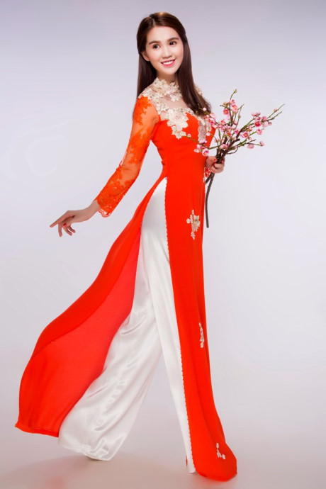 Gương mặt bầu bĩnh, mắt to tròn của Ngọc Trinh càng tôn lên vẻ đẹp của bộ trang phục áo dài truyền thống.