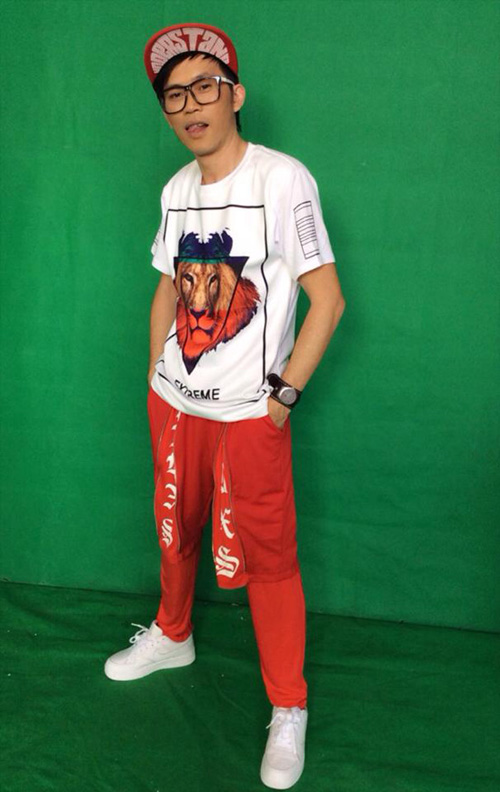 Hoài Linh đi giày thể thao, diện bộ đồ phong cách hip-hop và tạo dáng rất xì tin trong một buổi họp báo hồi tháng 10.2014.