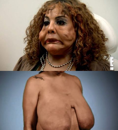 Rajee Narinesingh, 49 tuổi, ở thành phố Miami, bị bác sĩ rởm tiêm xi măng, keo dán lốp vào má, hàm và cổ khi muốn phẫu thuật chuyển giới. Mặt Rajee ngày càng biến dạng với những cục xi măng cứng. Ca phẫu thuật nâng ngực cũng khiến vòng 1 của cô chảy xệ khủng khiếp. Ảnh: E!