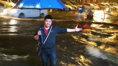 Quang Lê xắn quần, lội nước b́ bơm để trải nghiệm cảnh ngập lụt ở TP.Hồ Chí Minh