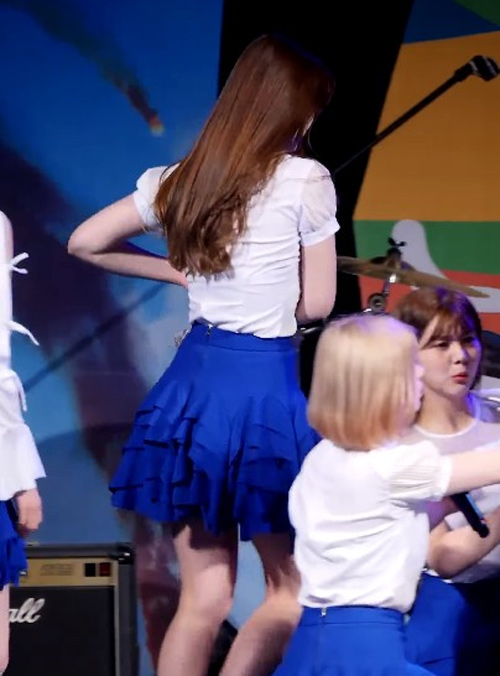 Ở một vài khoảnh khắc nghỉ của bài hát, Eunjin đã nhanh trí đưa tay chỉnh áo nhưng vì thời gian quá gấp rút nên chưa kịp chỉnh xong, cô nàng lại phải tiếp tục biểu diễn cùng các thành viên còn lại.