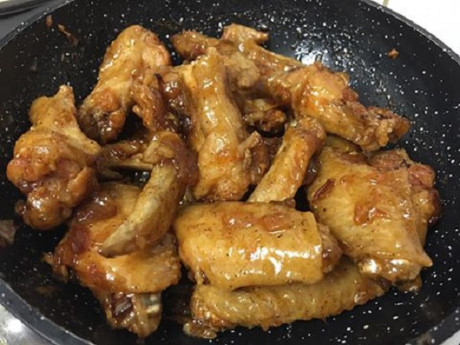 – Trong lúc đợi cánh gà chiên vàng thì bắc một cái chảo lớn khác, cho dầu vào, cho hành tây, hành tím vào trước, đảo sơ rồi cho tỏi vào. Nghe mùi thơm của hành tỏi ( không cần đợi vàng vì dễ cháy khét không ngon ) cho khoảng 2 muỗng canh nước mắm, đường vàng, bột ngọt, tiêu, ớt, gừng vào, đảo đều nêm nếm vưa ăn , để thêm vài phút tới khi nào hỗn hợp nước mắm hơi sền sệt.