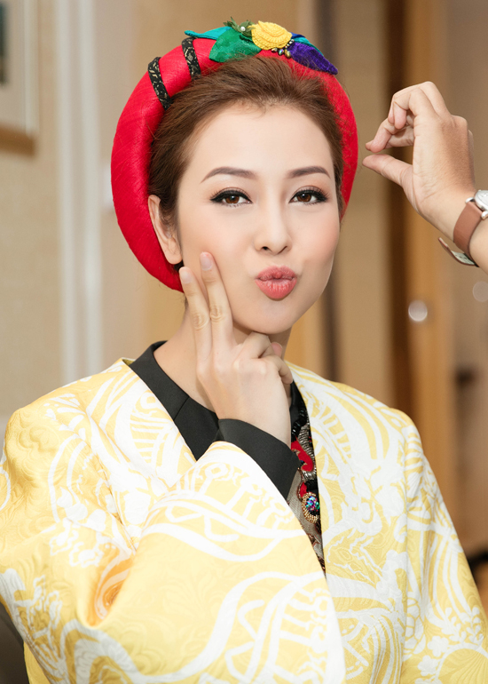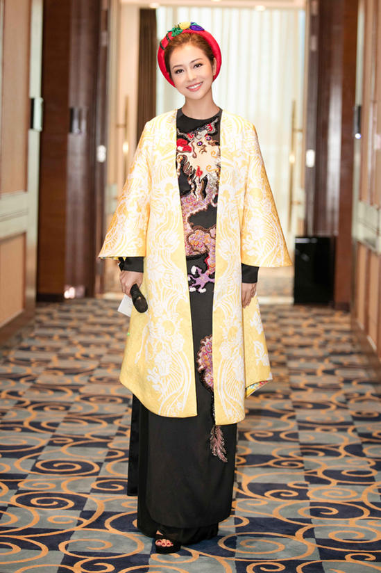 Người đẹp diện áo dài gấm, khoác áo bào và đội mấn như hình ảnh Hoàng hậu thời xưa. Bộ trang phục có giá khoảng 5.000 USD, được NTK Thuỷ Nguyễn thực hiện riêng cho Jennifer.