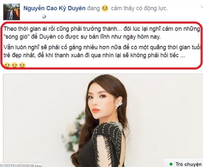 Kỳ Duyên viết: "Theo thời gian ai rồi cũng phải trưởng thành... đôi lúc lại nghĩ cảm ơn những "sóng gió" để Duyên có được sự bản lĩnh như ngày hôm nay. Vẫn luôn nghĩ sẽ phải cố gắng nhiều hơn nữa để có một quãng thời gian tuổi trẻ đẹp nhất, để khi thanh xuân đi qua nhìn lại sẽ không phải hối tiếc..."