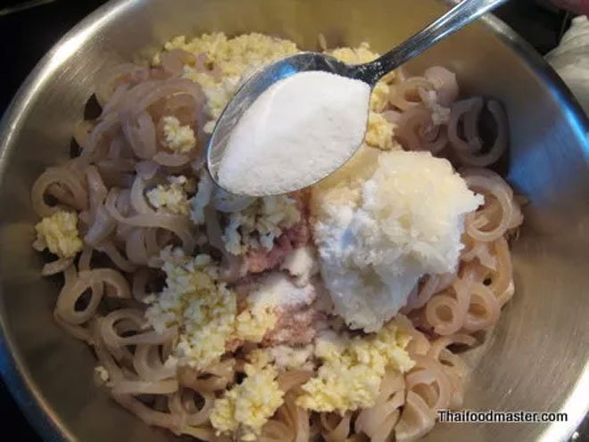 Cho tất cả các nguyên liệu thịt, bì, tỏi băm, cơm nếp, muối, đường và mì chính vào một bát to. Dùng tay trộn đều hỗn hợp thật kỹ.
