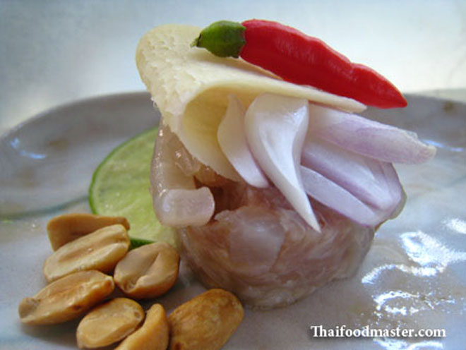 “Naem moo” là món nem chua truyền thống của Thái Lan, thường được ăn kèm với gừng thái lát, hành củ băm nhỏ, đậu phộng, ớt hiểm và hành lá. Hành tươi cay nóng hơi ngọt, hòa quyện với vị chua chua của naem, đưa món ăn lên một cung bậc hương vị mới ngon ngất ngây.