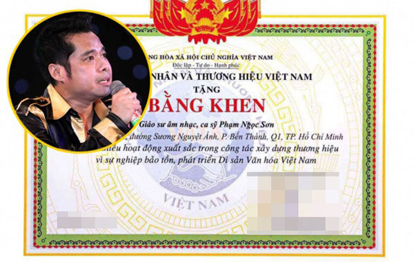 Sau đó, anh không quên thông báo: “Nam ca sĩ vui mừng khi được Hội Nghệ nhân và Thương hiệu Việt Nam tặng bằng khen v́ có những hoạt động xuất sắc trong sự nghiệp bảo tồn, phát triển di sản văn hóa Việt Nam. Bằng khen này phong tặng cho anh danh hiệu Giáo sư âm nhạc… Ngọc Sơn đă không giấu được niềm vui khi được nhà nước ghi nhận với danh hiệu này. Có thể xem Ngọc Sơn là nam ca sĩ Việt duy nhất hiện nay được ghi nhận danh hiệu Giáo sư”.
