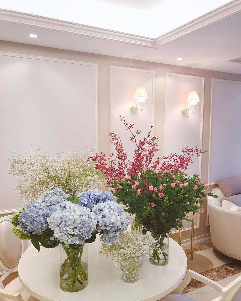 Điểm đặc biệt trong căn hộ của Phạm Hương là luôn tràn ngập sắc hoa.