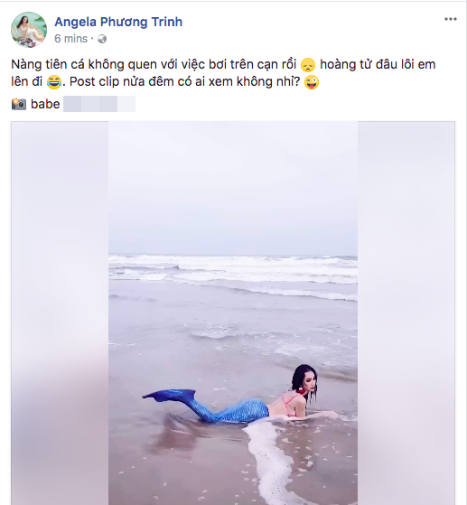 Tuy nhiên dường như đã hơi chán trong việc đăng ảnh mặc bikini khoe vòng 3 dày công tập luyện mà có rồi thì phải, trong video mới đây Angela Phương Trinh đã che chắn rất kĩ vòng 3 của mình bằng một... cái đuôi cá. Angela Phương Trinh đã biến mình thành một nàng tiên cá mắc cạn vẫy đuôi ngoe nguẩy bên bờ cát mà chỉ nhìn thôi cũng thấy sóng xô mạnh muốn tuột quần.