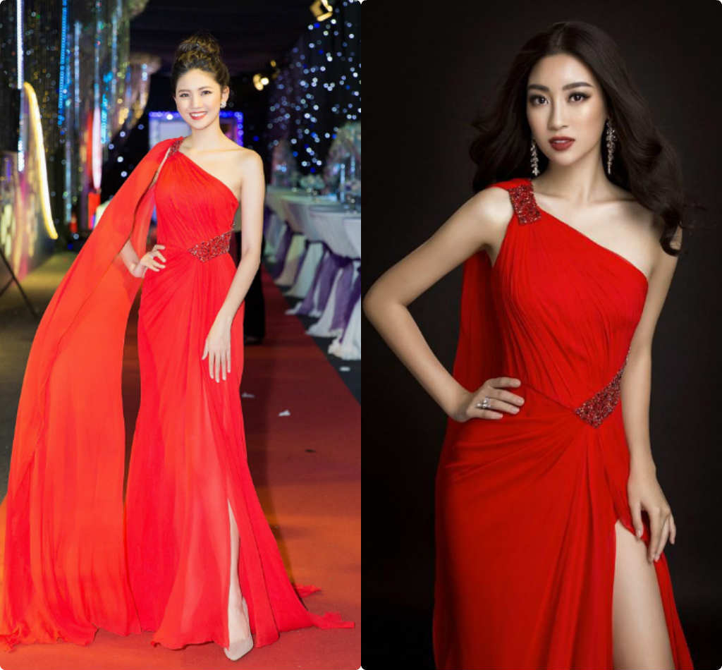 Nếu là fan của hai người đẹp này dễ dàng nhận ra bộ váy Á hậu Thanh Tú mặc từng được Hoa hậu Đỗ Mỹ Linh khoác lên mình khi cô thực hiện bộ ảnh thời trang trước khi lên đường tham gia Miss World 2017.