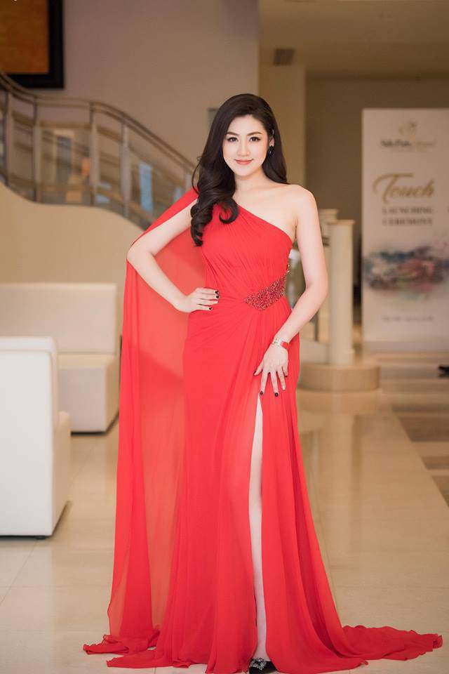 Trong sự kiện này, người đẹp diện chiếc đầm đỏ lệch vai của Nhà thiết kế Lê Thanh Hoà quyến rũ "đốn tim" người nhìn.