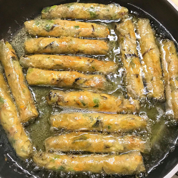 - Rán nem: Cho 3,4 giọt dấm vào dầu nguội, bật bếp đậy vung cho dầu sôi ko bị bắn. Thấy dầu bắn lách tách thì tắt bếp, hết bắn thì mở bếp đun cho dầu nóng già, cho từng cái nem lăn tròn đều trong chảo. Giữ lửa vừa và trở đều tay, khi thấy nem sắp vàng thì om lửa nhỏ để chín nhân và giòn vỏ bên trong. Trở đều tay, cho to lửa hơn nếu thấy dầu ko sôi. Nem vàng đều thì lấy ra đĩa nhưng ko xếp chồng nem lên nhau. Rán nem làm hai lần: lần 1 rán sơ qua,lần hai khi nào gần ăn rán lại cho vàng đều.