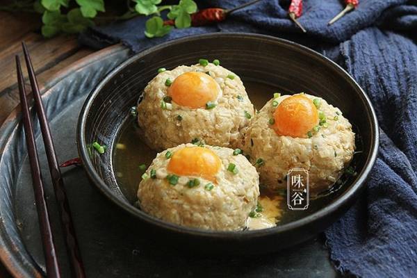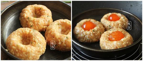 Trứng muối đập ra, lấy lòng đỏ, đặt vào giữa lỗ tròn của miếng thịt băm.