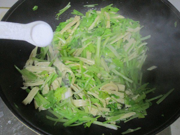 - Xào tiếp cần tây, thêm một chút muối, khi cần tái chín thì trút thịt vào xào chung.