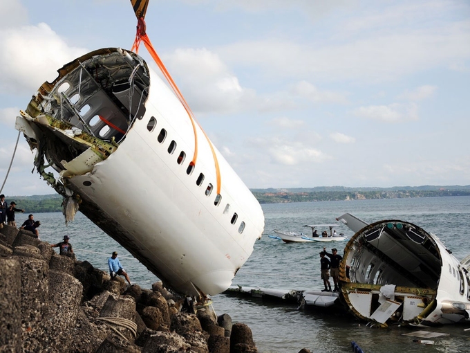 Chiếc Boeing 737 MAX được trục vớt sau khi gặp nạn tháng 10/2018. Ảnh: AFP