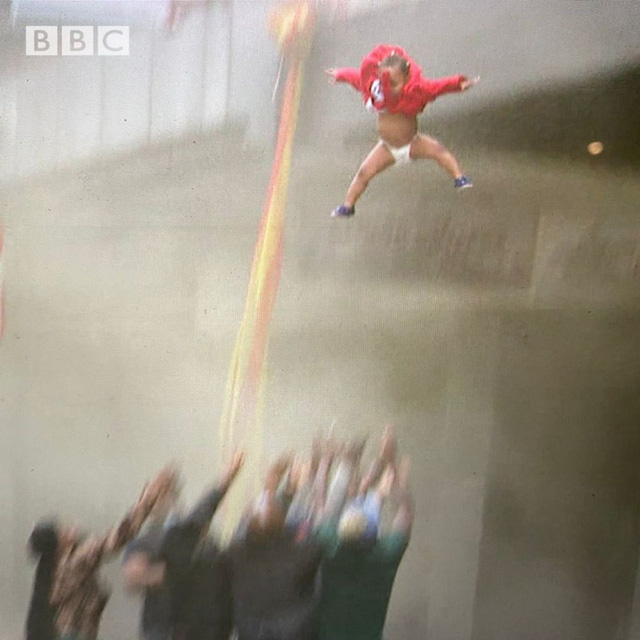 Bé gái được ném xuống bên dưới và may mắn không hề hấn gì. Ảnh: BBC