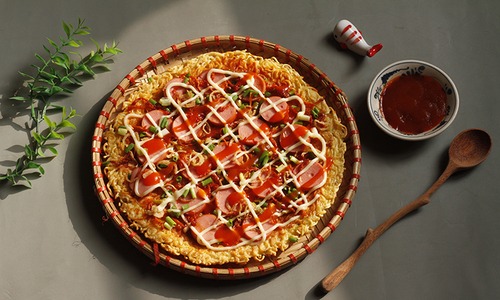 Làm phần topping: Dàn đều lên mặt đế mỳ tôm một lớp tương cà, thêm xúc xích, bò khô xé sợi, hành lá, phô mai và đậy vung để phô mai tan chảy.