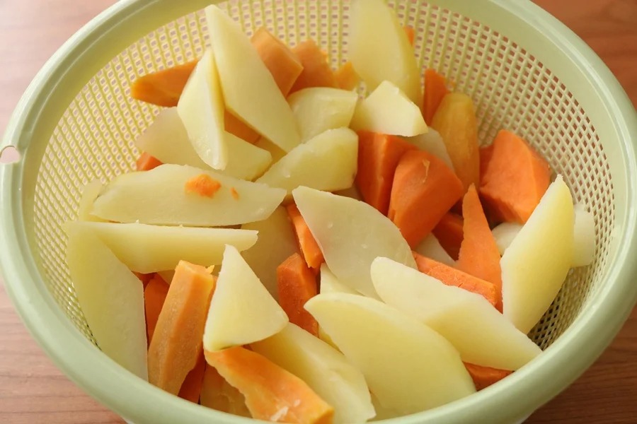 Sơ chế khoai: Khoai lang và khoai tây gọt vỏ, rửa sạch sau đó thái thành khối dạng hình tam giác.