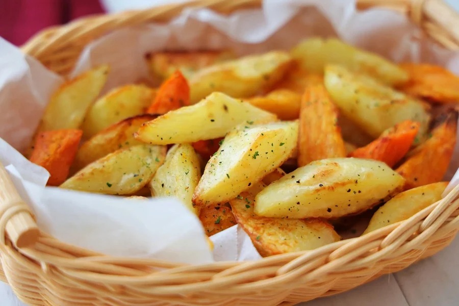 Cho khoai vào túi đựng thực phẩm, thêm chút muối, hạt tiêu đen và 30ml dầu oliu hoặc dầu ăn rồi lắc đều.