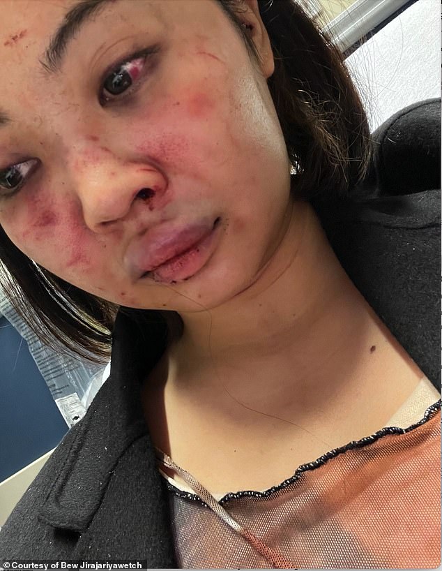 Cô gái Thái Lan chia sẻ bức ảnh sau khi bị hành hung, cho thấy gương mặt cô bị sưng và có nhiều vết trầy xước. Phần bên trong mắt trái đỏ bất thường.