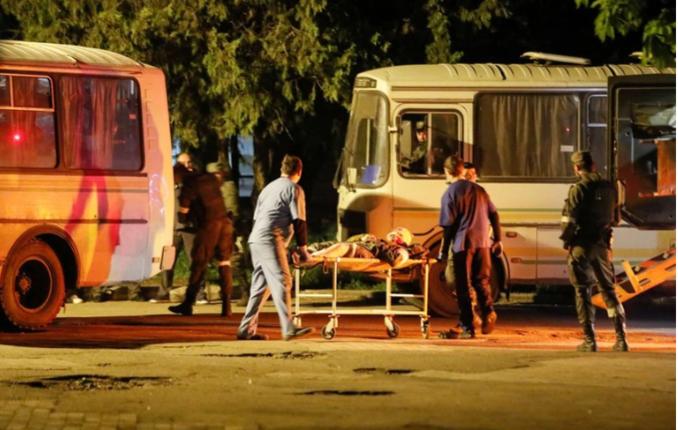 Xe chở các binh sĩ được sơ tán khỏi nhà máy Azovstal (Ảnh: Reuters).