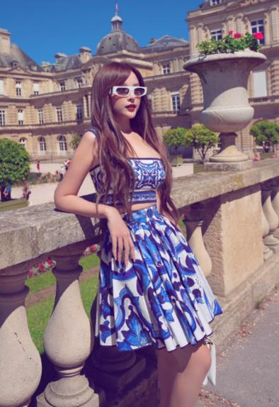 Check - in trong khung cảnh cổ kính ở Luxembourg, Huyền Baby lựa chọn kiểu váy hoa mang đến hình ảnh của tiểu thư quyền quý. Cô kết hợp với mẫu túi Louis Vuitton màu trắng.
