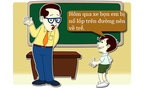 - Thưa giáo sư xe bọn em bị nổ lốp nên về trễ. Xin giáo sư cho chúng em được thi lại vào ngày mai ạ.