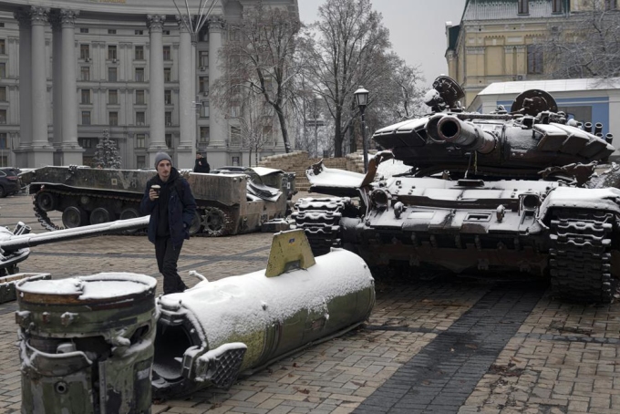 Người dân đi qua xác xe tăng Nga tại thủ đô Kiev, ngày 17/11. Ảnh: AP.