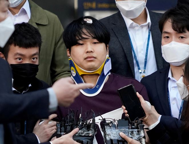 Cho Ju-bin được đưa ra trước giới truyền thông bên ngoài đồn cảnh sát Seoul.
