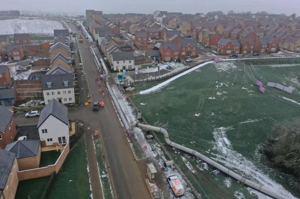 H́nh ảnh chụp từ trên cao cho thấy quy mô khổng lồ của đường ống cống h́nh con rắn này. Nó chỉ cách cửa nhà dân vài mét và nằm trong khu dân cư Wendelburie Rise, do Công ty nhà đất Bovis Homes xây dựng ở Northamptonshire.
