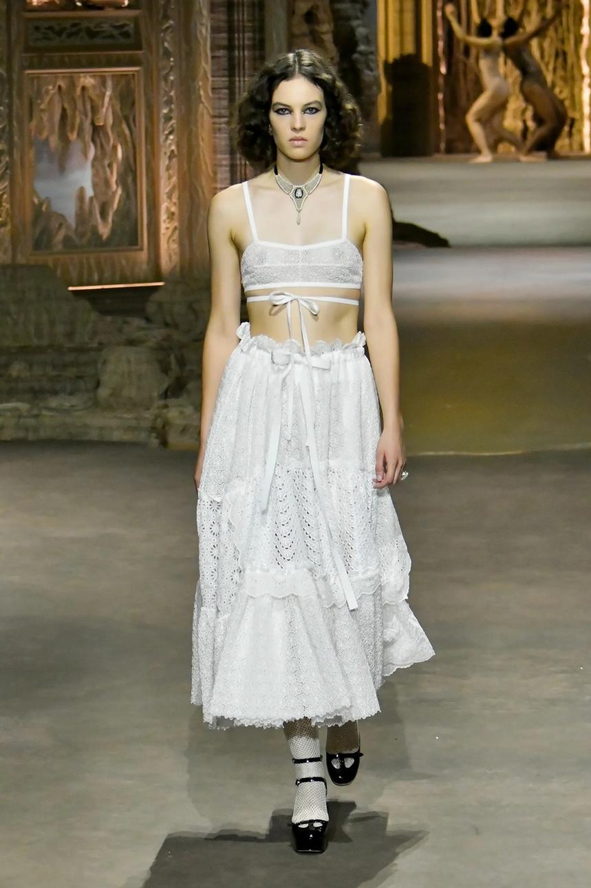 Mặt khác, Dior đã chọn cho ra mắt các mẫu váy thêu cực kỳ nữ tính được tô điểm bằng ruy băng và ren trắng. Nhãn hiệu thời trang mới Miroir Palais giới thiệu một loạt váy maxi dài, từ váy xòe XXL đến váy lót trong suốt.