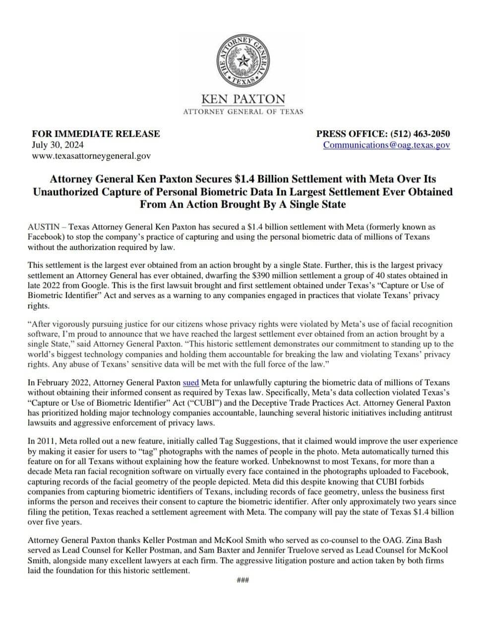 Bộ trưởng tư pháp Texas , Ken Paxton thông báo: Facebook đã đồng ý trả 1.4 tỷ cho Texas. Đây là số tiền lớn nhất của một tiểu bang kiện một công ty tư.