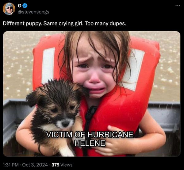 In early October 2024, as the U.S. Southeast worked to recover from Hurricane Helene, a viral photograph claimed to show a crying girl and her puppy on a boat being rescued from the storm's devastation. Many posts on X used it to criticize U.S. Vice President Kamala Harris' handling of aid to affected regions.