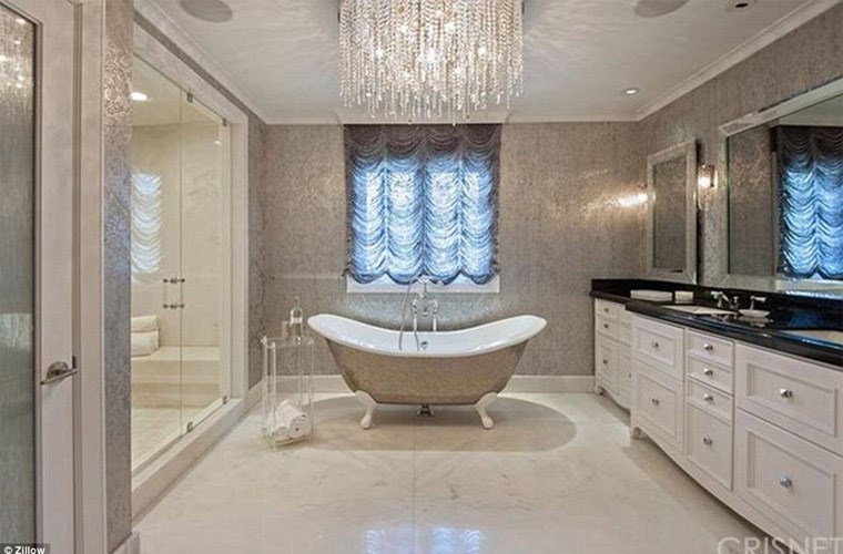 Phòng tắm thêm phần sang trọng với dàn đèn chùm lấp lánh.