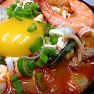 Cuối cùng đập 2 trứng vào nồi soup đang sôi, hạ lửa nhỏ để 1 lúc lòng đỏ trứng hơi chín thì tắt lửa, rắt hành lá lên.