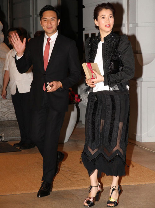 Vietbf.com - Vợ chồng Trương Trí Lâm sánh vai nhau đi tham dự đám cưới của đồng nghiệp Quách Phú Thành ở Hong Kong. Hôn lễ của nam tài tử Quách Phú Thành Hoa hậu Viên Vịnh Nghi diện váy xuyên thấu trong tiệc cưới buổi tối.